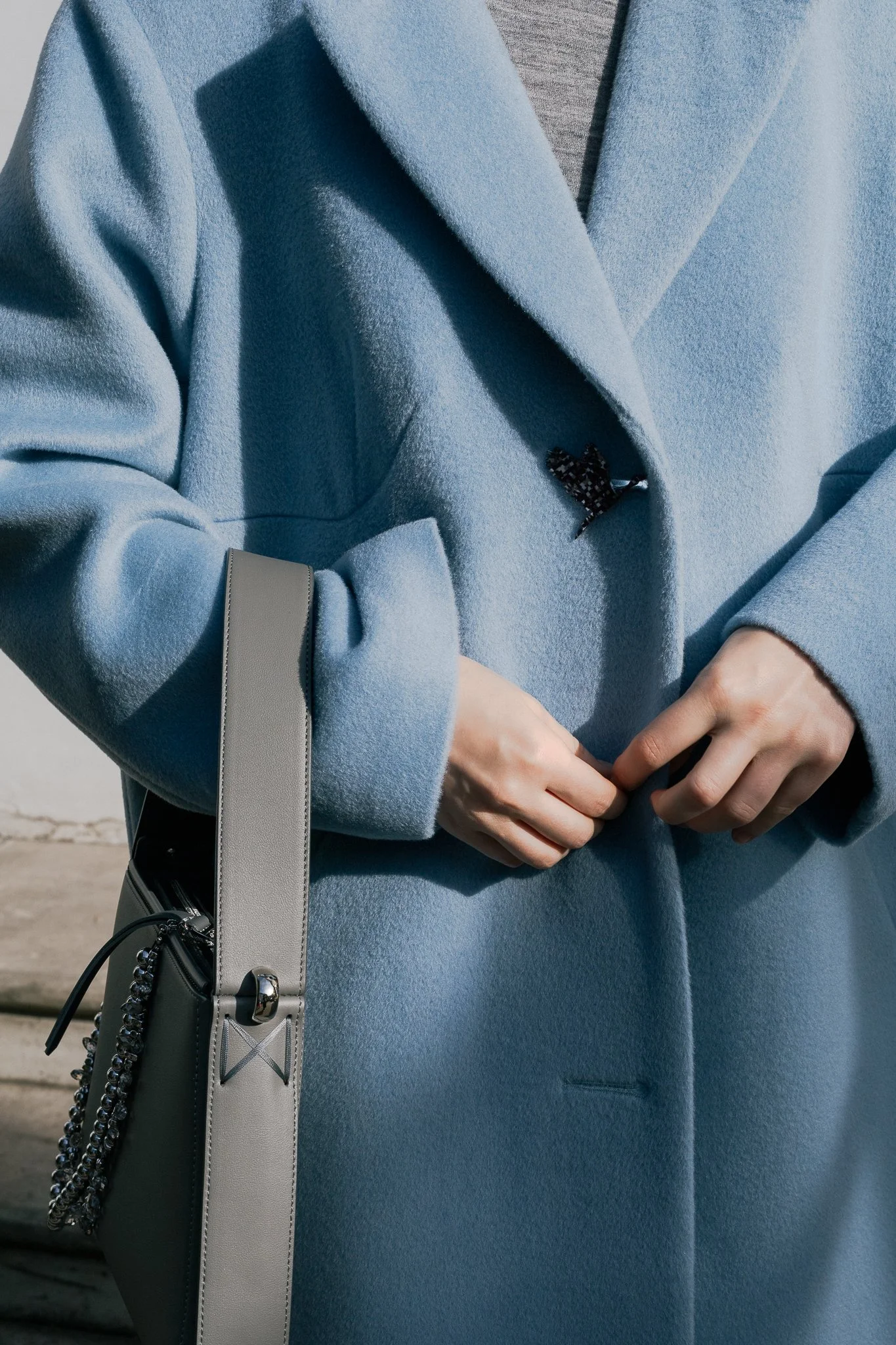 A classic fall/winter garment offering a feminine touch, this long cashmere coat fabric and lined with silky viscose has one-breasted buttons, notch lapels, two front pockets, a high leg slit in back. The coat features three acetate buttons in the shape of a stork, a result of our collaboration with NINIco, adding a unique and artisanal accent to the design.